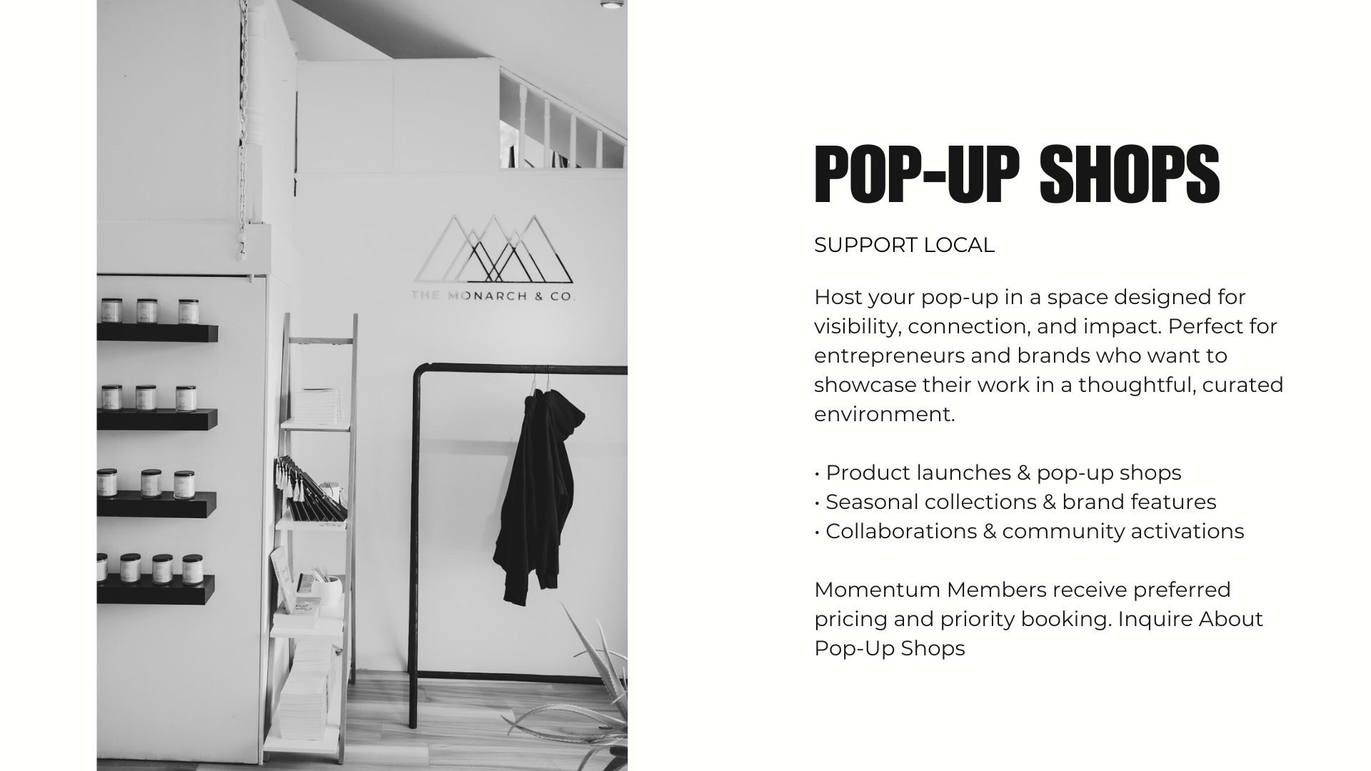 Perfect For: hosting workshops, small group experiences, team sessions, VIP days, photoshoots, branded content, podcasts, retreats, and pop-up shops in a downtown setting.