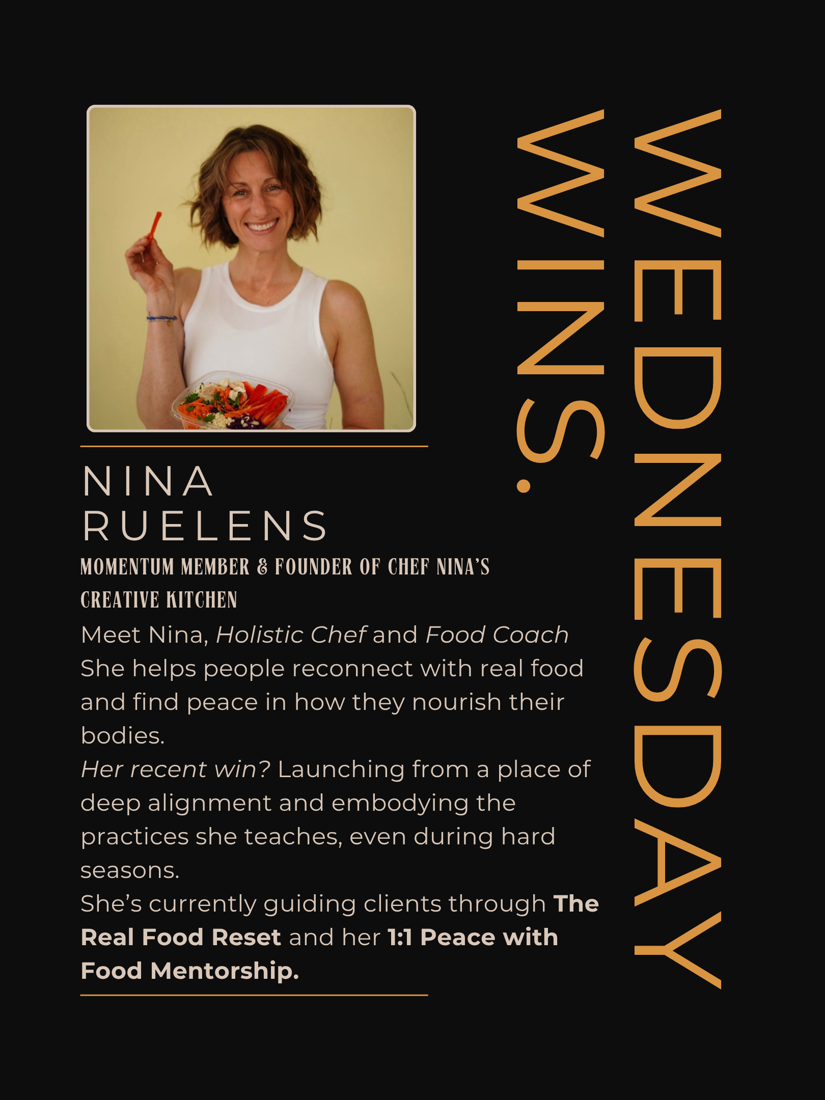 This week, we’re celebrating a beautiful win from Momentum Member Nina Ruelens, a Holistic Chef and Food Coach who helps people reset their relationship with food, reconnect to their bodies, and redefine nourishment from the inside out.