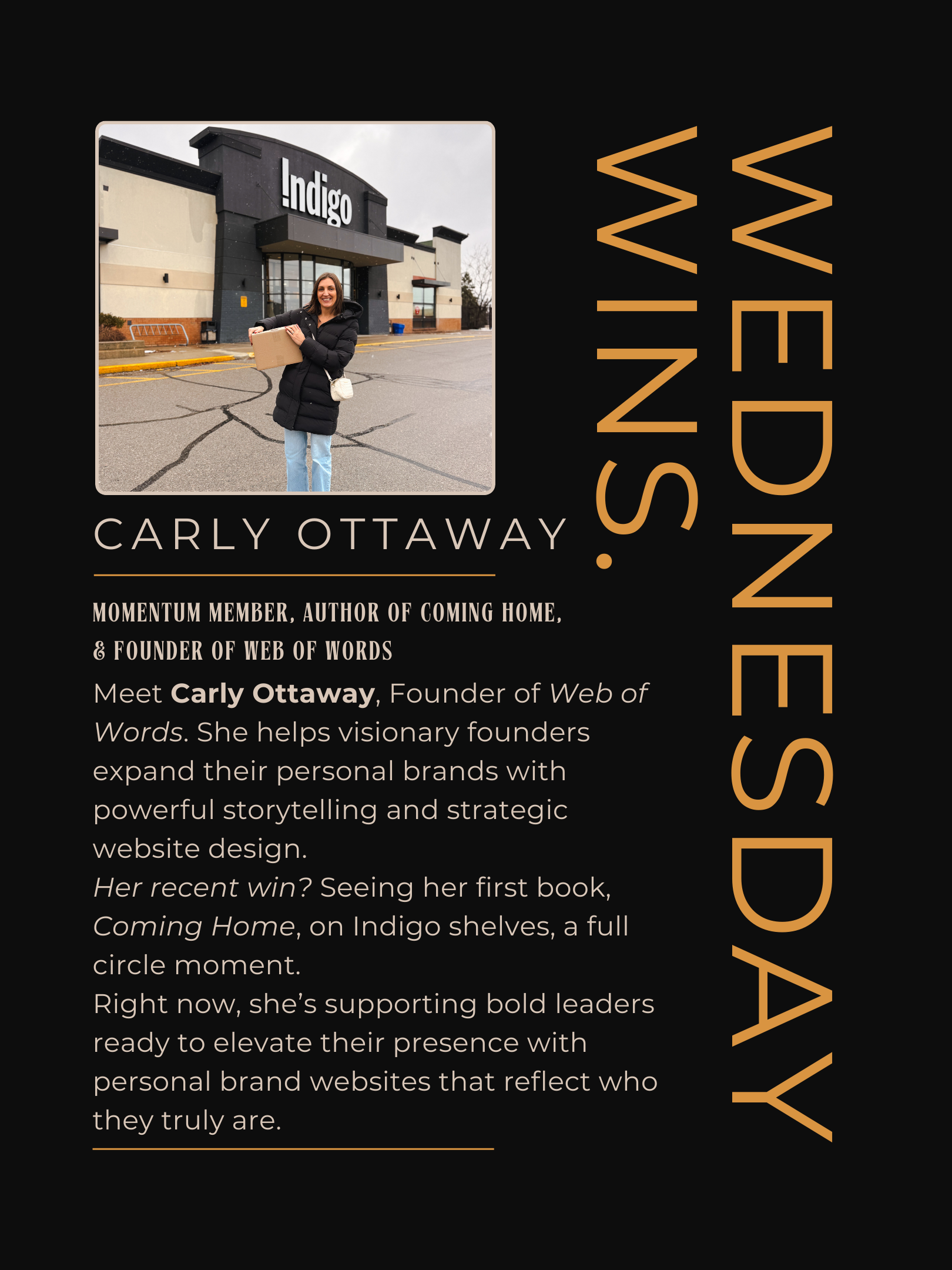 Carly is the founder of Web of Words, Momentum member, and the very first author to be published through The Monarch & Co. Publishing. Her debut book, Coming Home, launched this past fall and is now officially on shelves at Indigo! Walking into the store with her kids and seeing her book in person was a surreal, full-circle moment. The kind you dream about for years, and then finally get to hold in your hands.